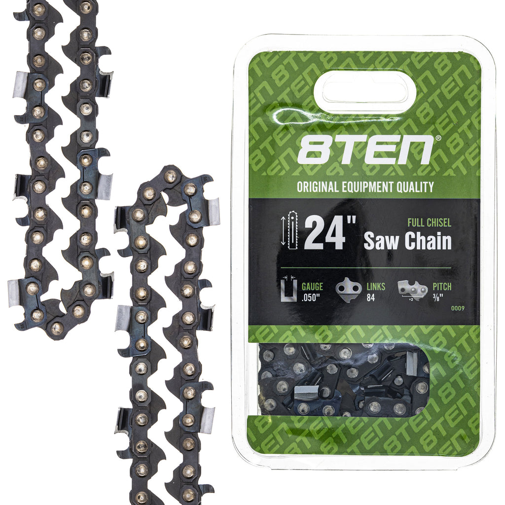 - Chainsaw Specs - Cutting Length 24 Inch; Gauge .050 Inches; Pitch .375 Inches (3/8"); Drive Link Count 84; Chain Type Full Chisel; Guide Bar Type Removable Sprocket